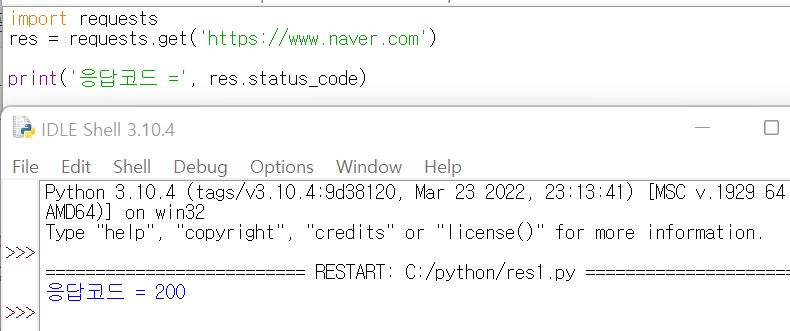 그리고 status_code가 200 또는 requests.code.ok라면 정상이라고 출력합니다.