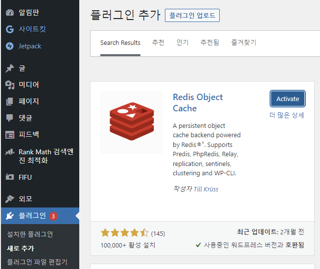 설치 이후에 이제 워드프레스로 돌아와서 다양한 redis object cache 플러그인을 설치해주구요.