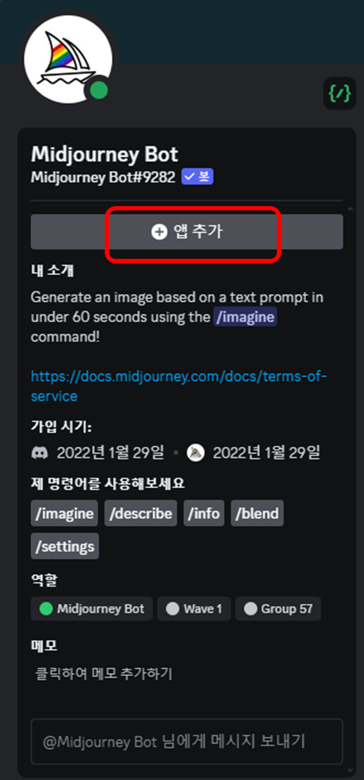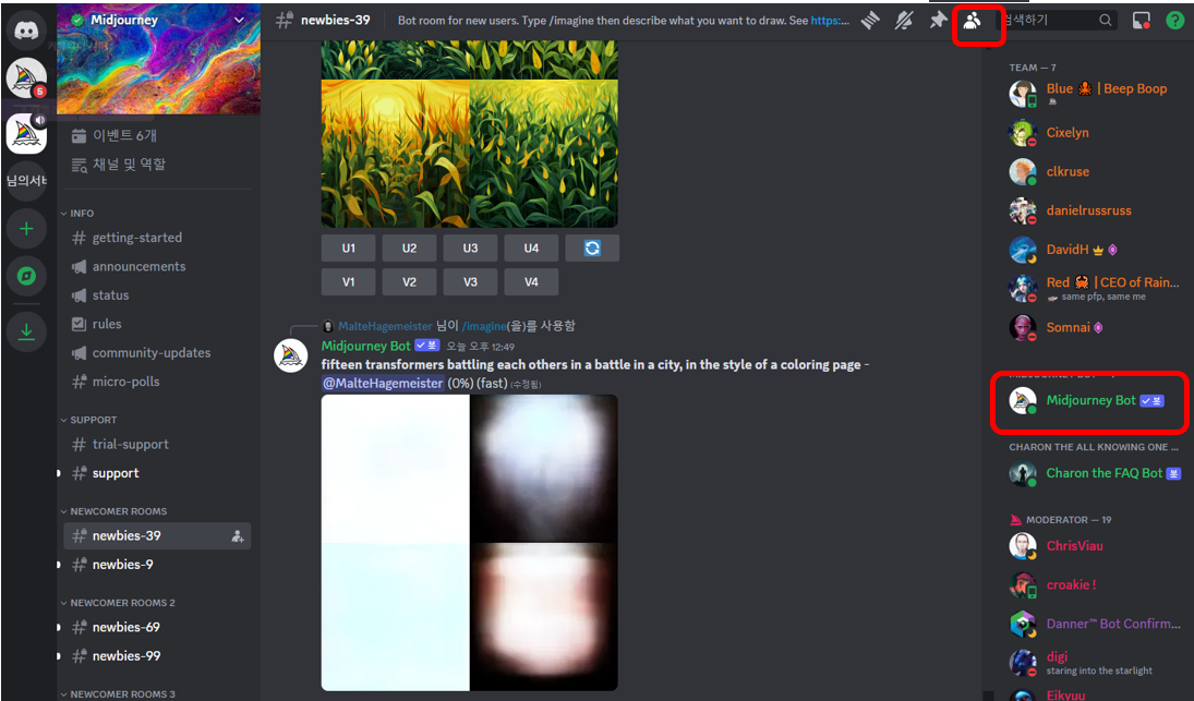 이제 미드저니 서버에 들어가신 다음 상단의 멤버보기를 누르고, Midjourney bot을 클릭합니다.