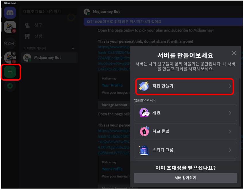디스코드 메뉴에서 +를 눌러서 직접 만들기를 통해 서버를 추가합니다.
