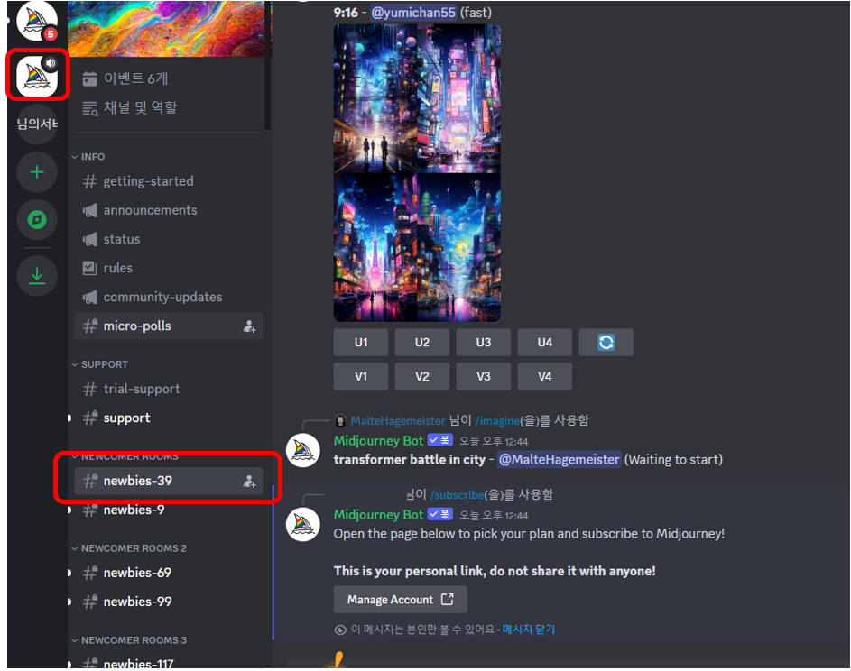 그러면 이제 디스코드에 미드저니가 추가되는데요. newbie탭에서 미드저니의 구독을