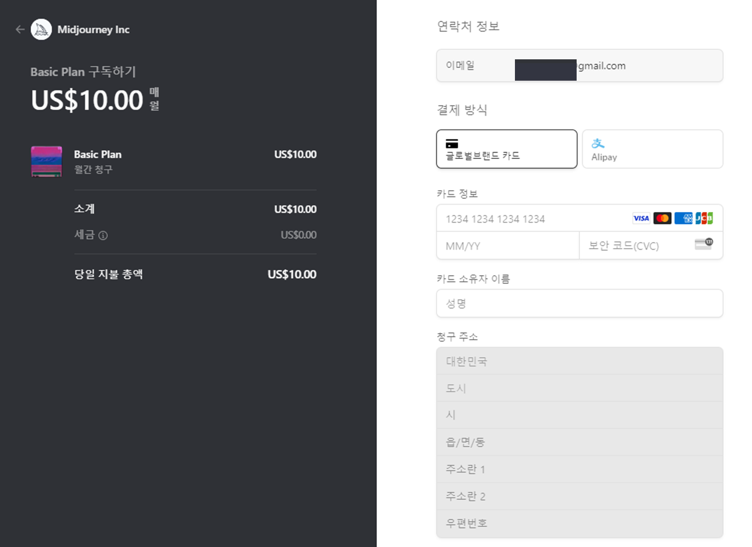 이후 월간 플랜으로 해서 10달러 베이직 플랜을 구독합니다.