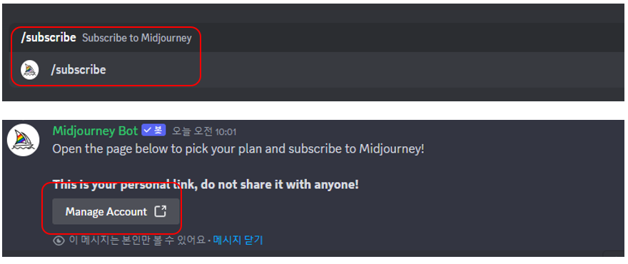 먼저 미드저니 디스코드에서 subscribe 명령어를 통해서 manage Account를 실행합니다.