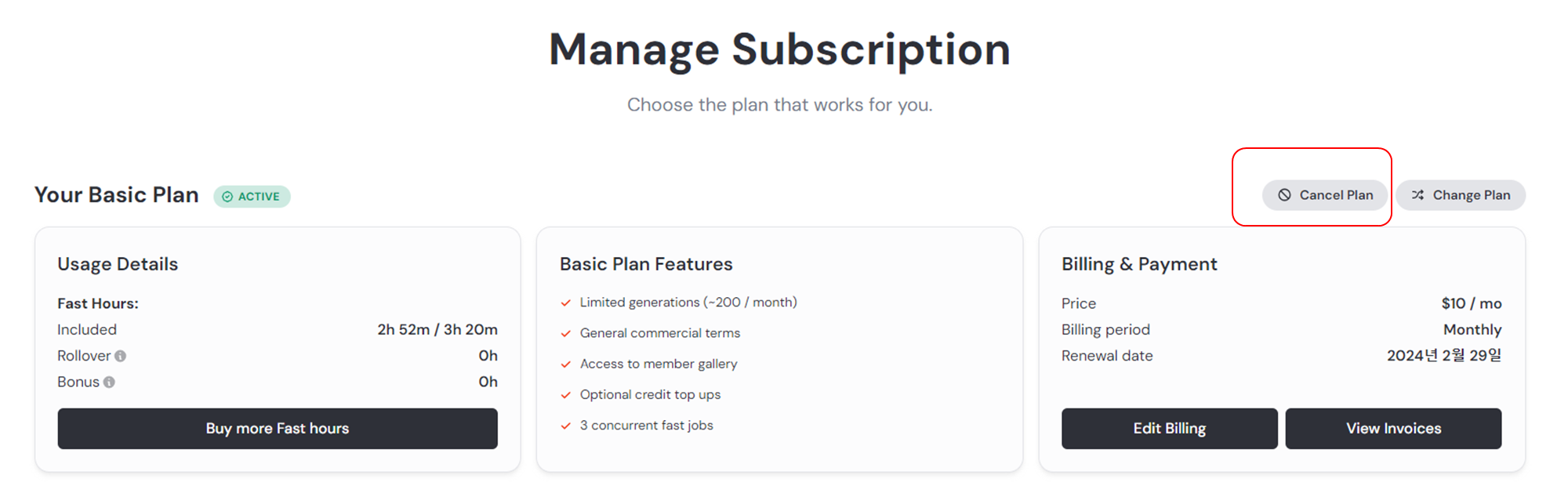 이 후 상단에 위치한 Cancel Plan을 클릭합니다.