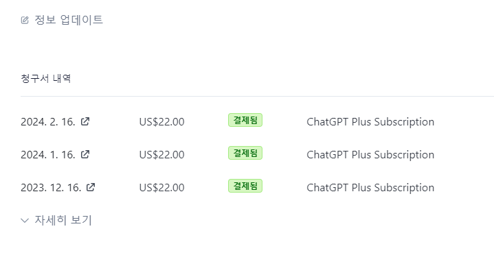 그리고 구독 하단에 보면 청구서 내역을 확인할 수 있고, 이곳에서 영수증도 확인이 가능합니다.