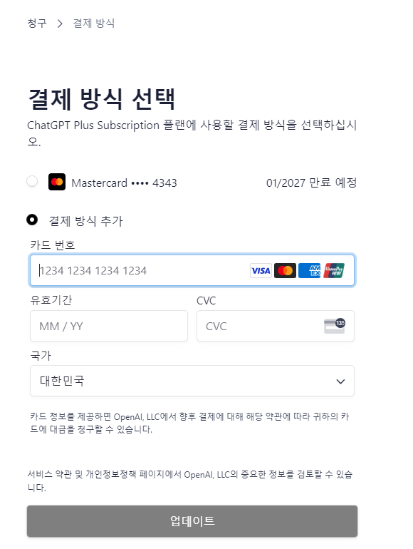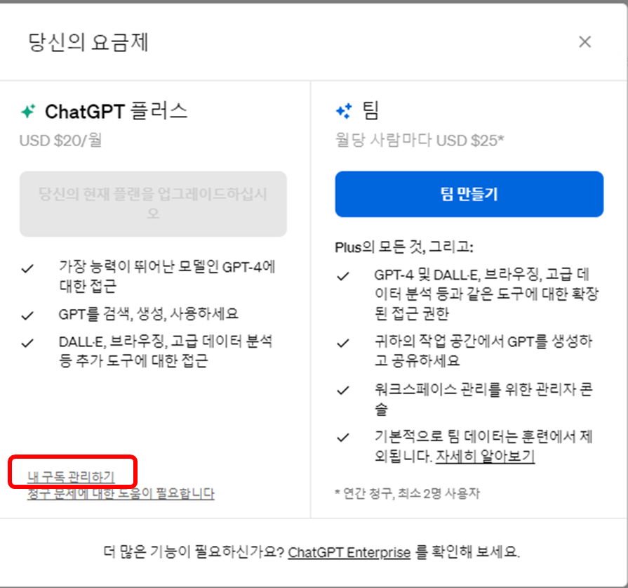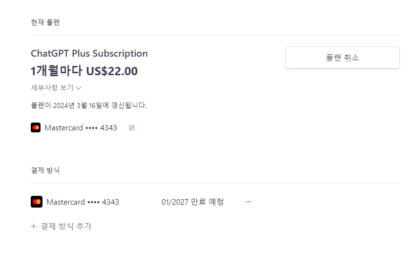 해당 메뉴에는 ChatGPT 유료 구독을 변경하거나 취소 또 카드를 변경할 수 있는데요.