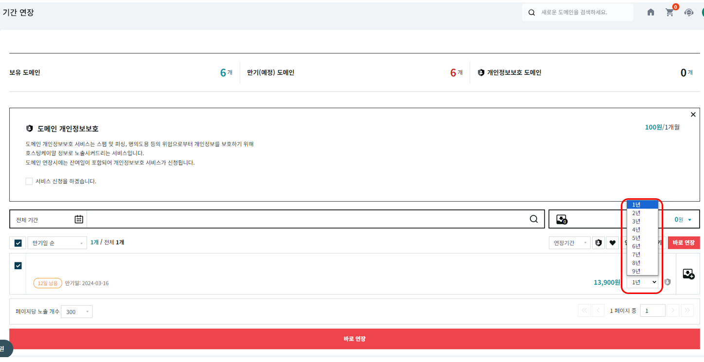 하단에서 원하는 연도를 선택하여 연장하시면 됩니다. 1년에 13,900원 정도입니다.