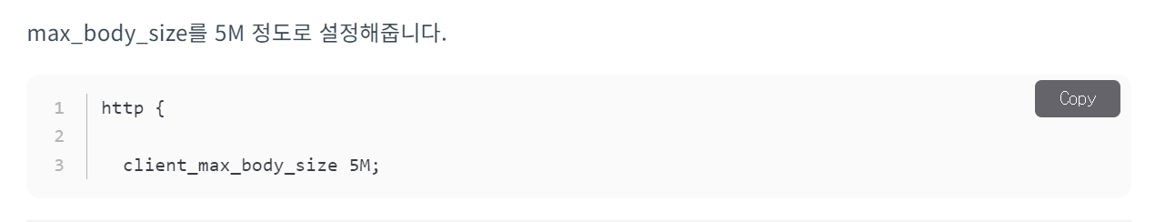 | nginx 413 Request Entity Too Large메시지 해결하기 (1) | 2024.03.08 |