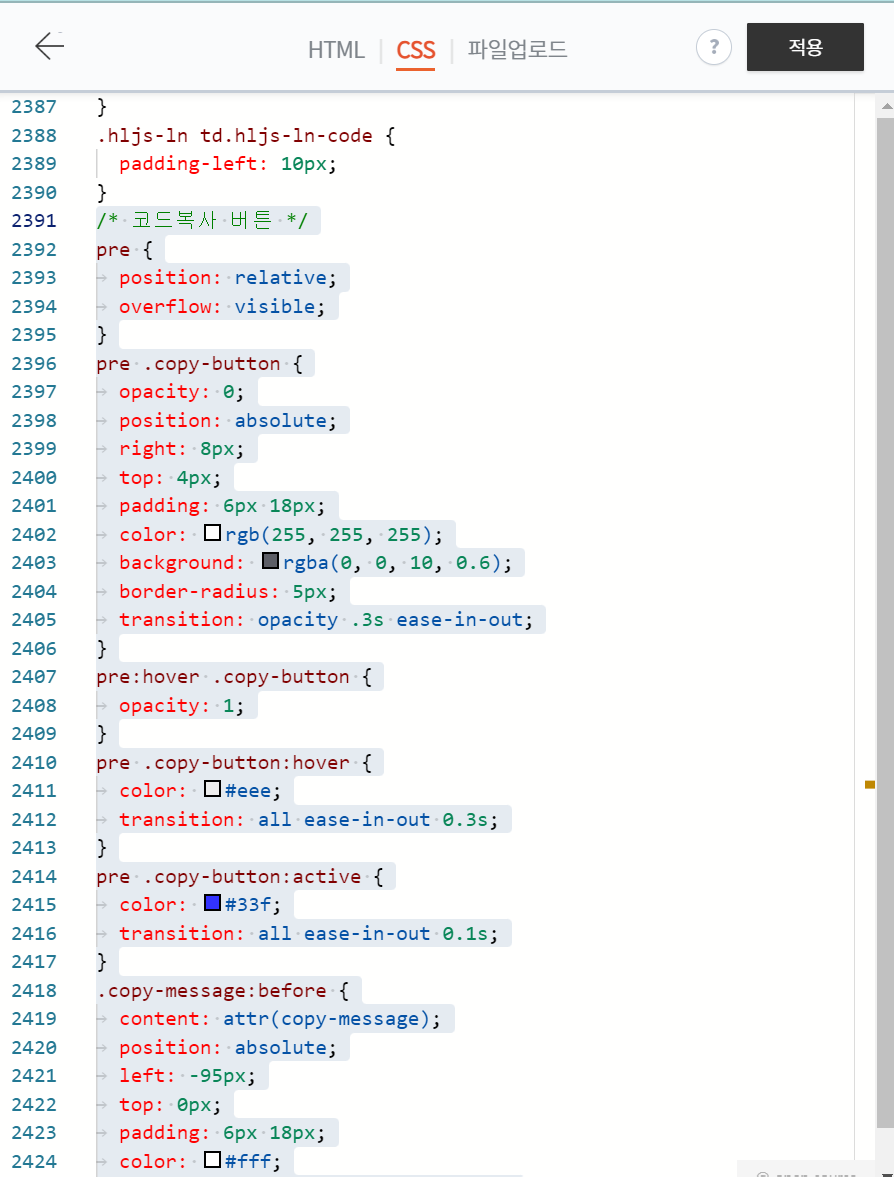 CSS 수정 젤 하단에 복사해주면 됩니다. 그리고 원하는 색깔로 변경해주시면 됩니다.