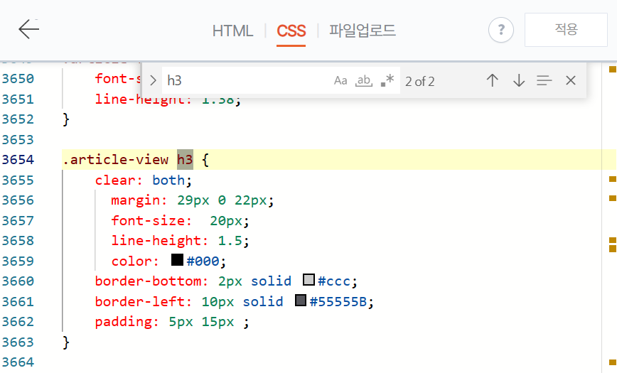 그리고 CSS 편집으로 가셔서 H3를 검색하시면 되는데요.