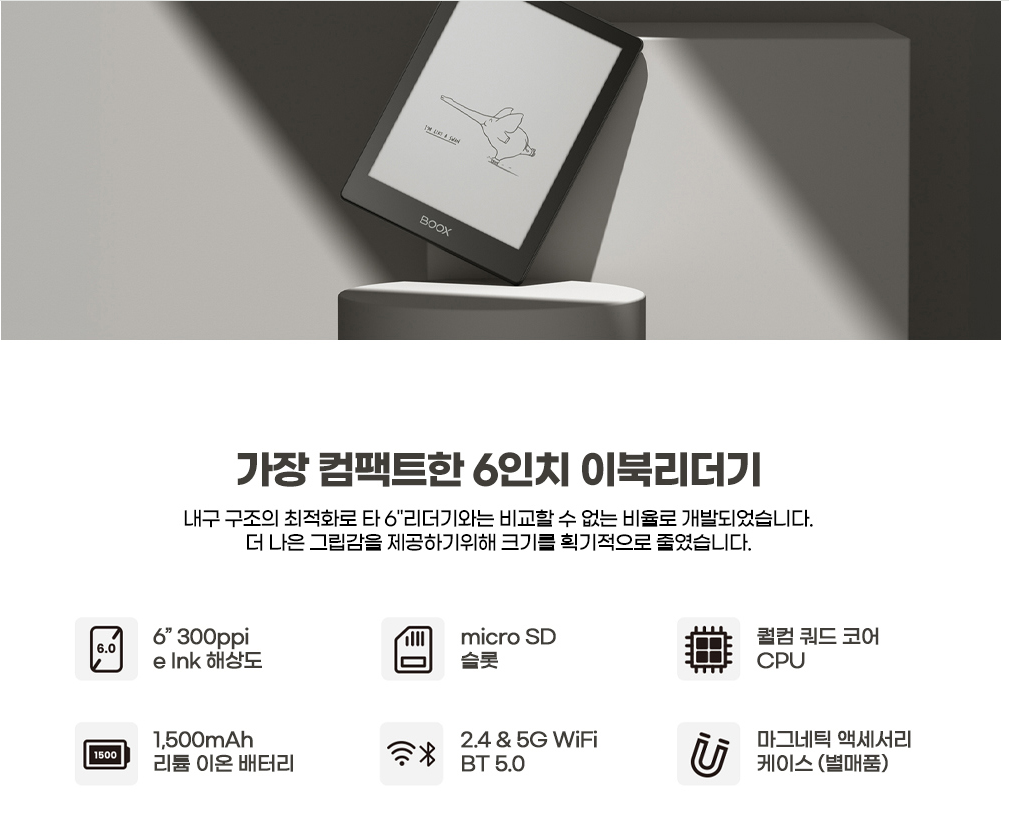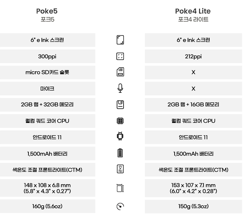 추천 모델인 포크5의 경우 300DPI의 해상도에 6인치 모델입니다. 300DPI가 되지 않는 저해상도 모델의 경우 화면 해상도가 떨어져서 독서에 집중하기 힘듭니다.