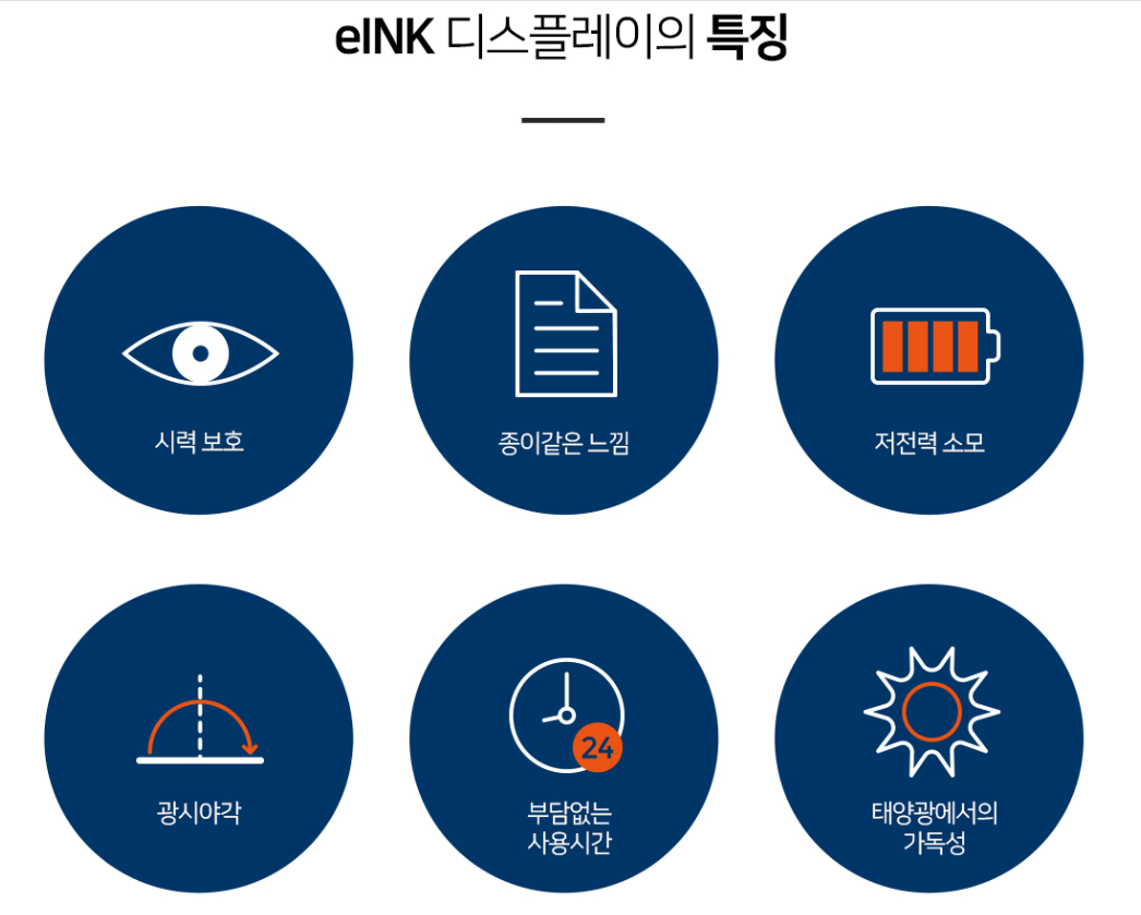일반적으로 기존의 LCD나 LED의 액정이 아닌 잉크책의 느낌을 가진 eINK 디스플레이를 사용하는 기기를 말하는데요. 특징은 종이같은 느낌의 시력보호가 되는 액정이며, 전기역시 적게먹어서 오래 동안 사용이 가능합니다.