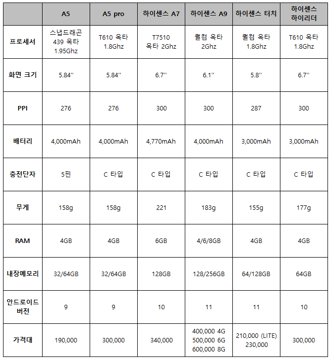 이외에 국내에 출시된 주요 기기의 정보는 아래 이미지를 참고해보시기 바랍니다.