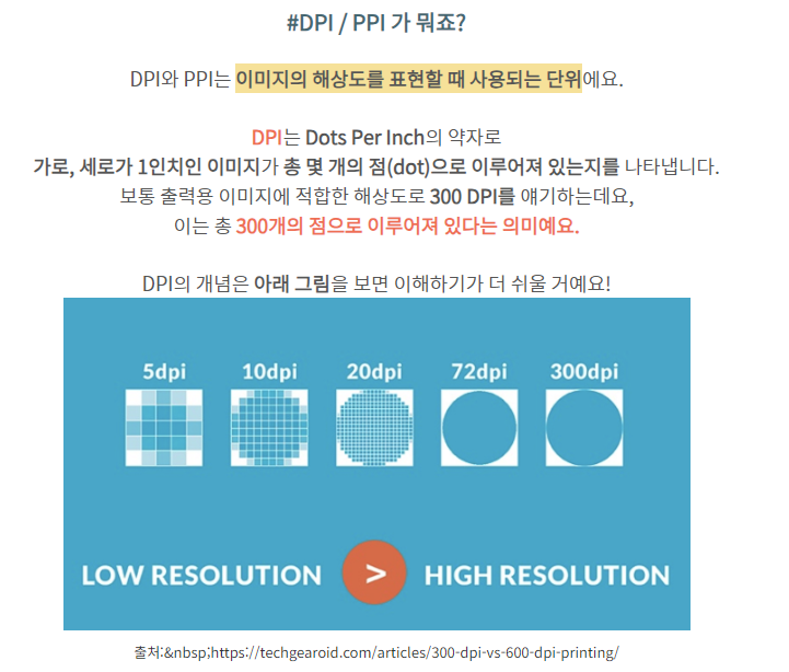 DPI의 경우 아래와 같이 깨져보이기 때문에 300DPI 이상은 되어야 합니다.