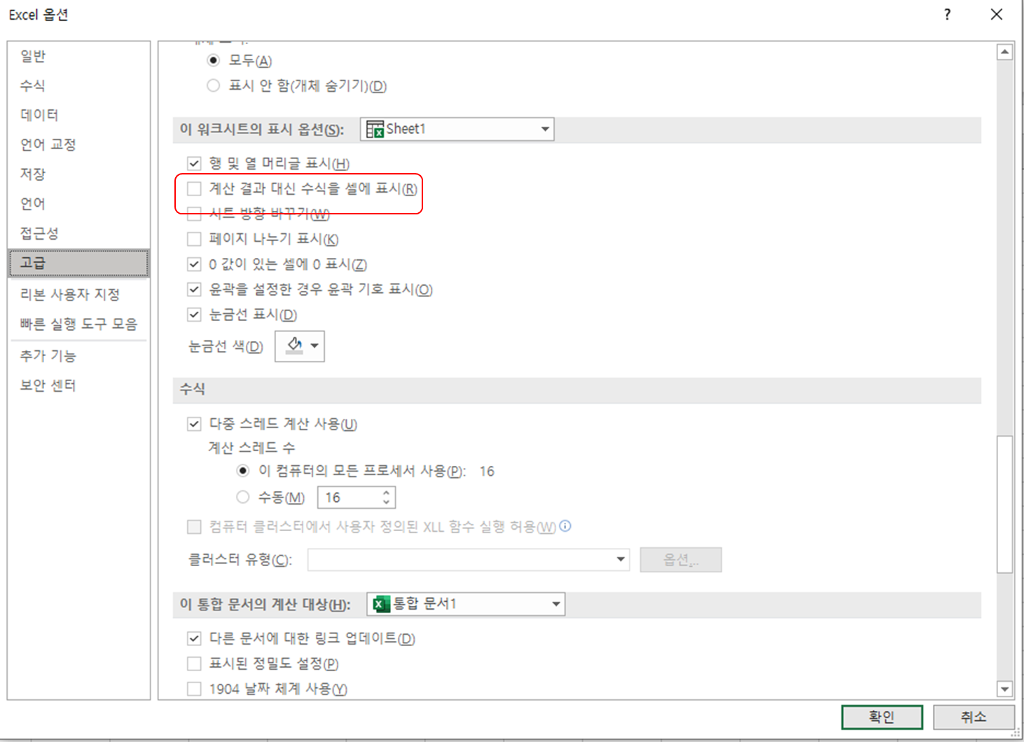 그리고 마지막으로 엑셀 옵션 고급에서 계산 결과 대신 수식을 셀에 표시에 체크가 되어 있는 경우 계산이 되더라도 표시가 안되는 경우가 있습니다. 기본값은 설정되어 있지 않은데, 간혹 수식이 필요한 경우 해당 옵션이 활성화되어 있을 수 있습니다.