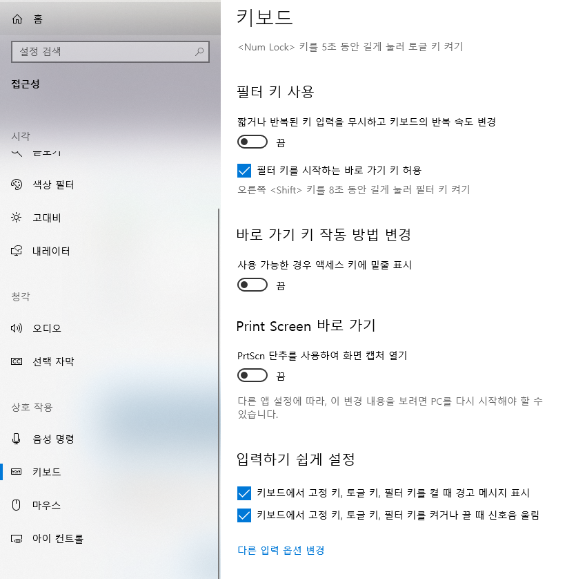 이후 키보드 메뉴에 들어가서 하단에 보면 Print Screen 바로가기라는 메뉴가 있는데요.