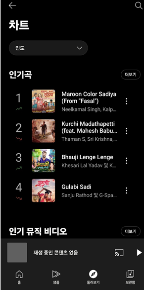 유튜브 뮤직의 둘러보기 - 실시간 차트를 눌렀을 때 인도 차트가 나오면 정상적으로 동작하는 것입니다.