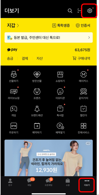 카카오톡이 로그인 했는지 확인하는 방법은 하단의 더보기 - 상단의 톱니바퀴 설정 메뉴로 들어갑니다.