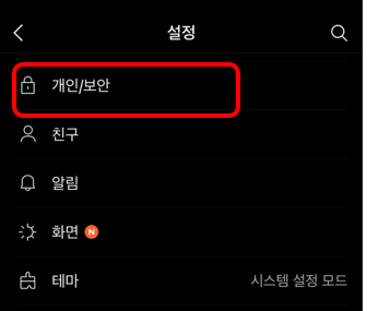 이후 설정 메뉴에서 개인/보안 메뉴로 들어갑니다.