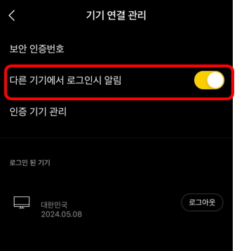 기본적으로 보안을 위해서 다른 기기에서 로그인시 알림 메뉴를 활성화 합니다.