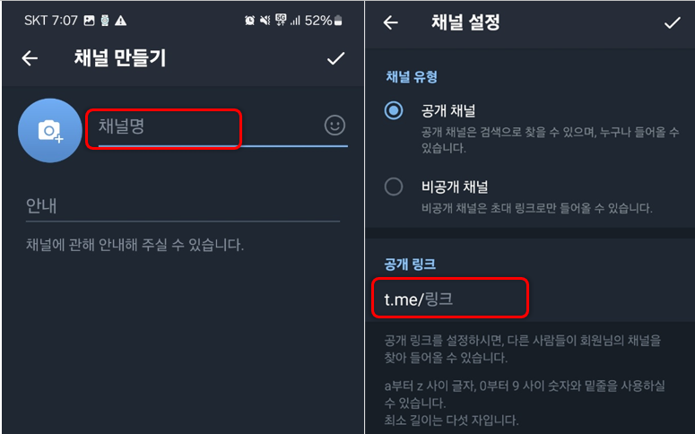 채널 명은 외부에서 보이는 채널이름이고 공개 링크가 이제 중요한데요. t.me 공개링크를 만들고 꼭 기억해야 합니다.