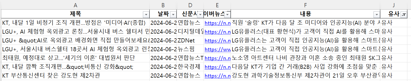 agent.invoke('나는 기자인데, 기사의 제목과 내용 열을 보고 약 80%이상 유사한 기사가 있으면 유사에 유사라고 표시해 줘')