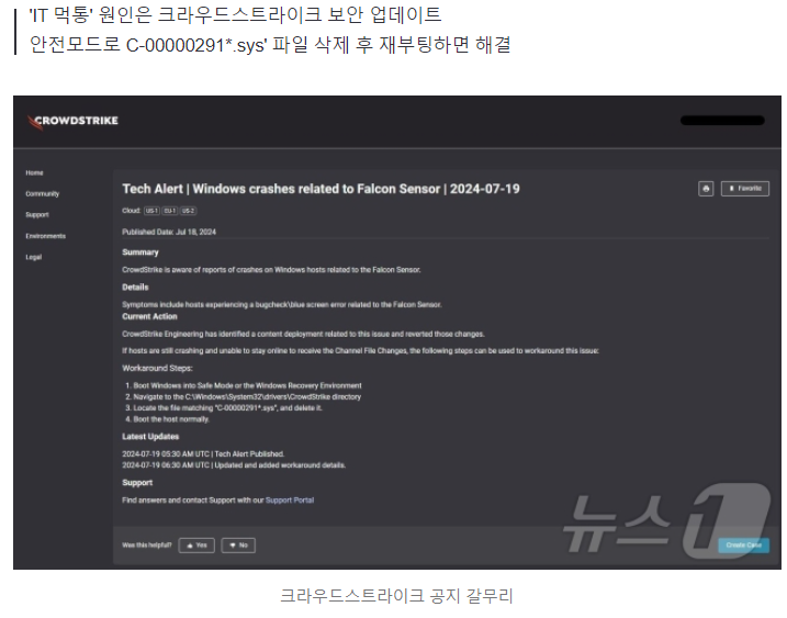 크라우드스트라이크는 "윈도 안전모드로 접속해 특정 명령어를 입력해 'C-00000291*.sys' 패턴과 일치하는 파일을 찾아 삭제하거나 폴더 이름을 변경한 후 재부팅하면 된다"고 설명했습니다.