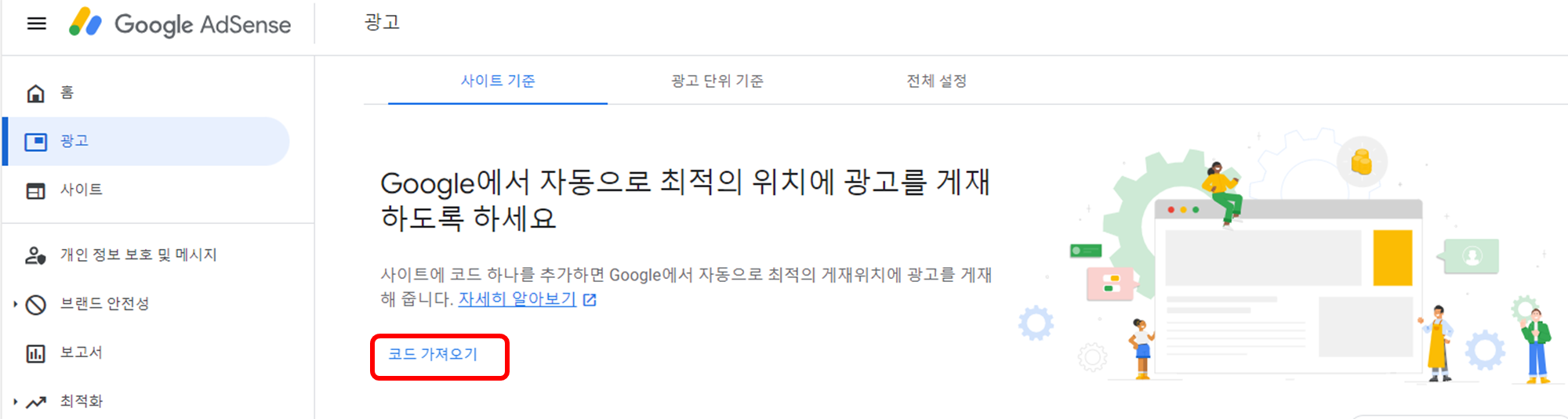 먼저 애드센스에 들어가신 다음 광고 - 코드가져오기를 누르시면 광고 코드를 볼 수 있습니다.