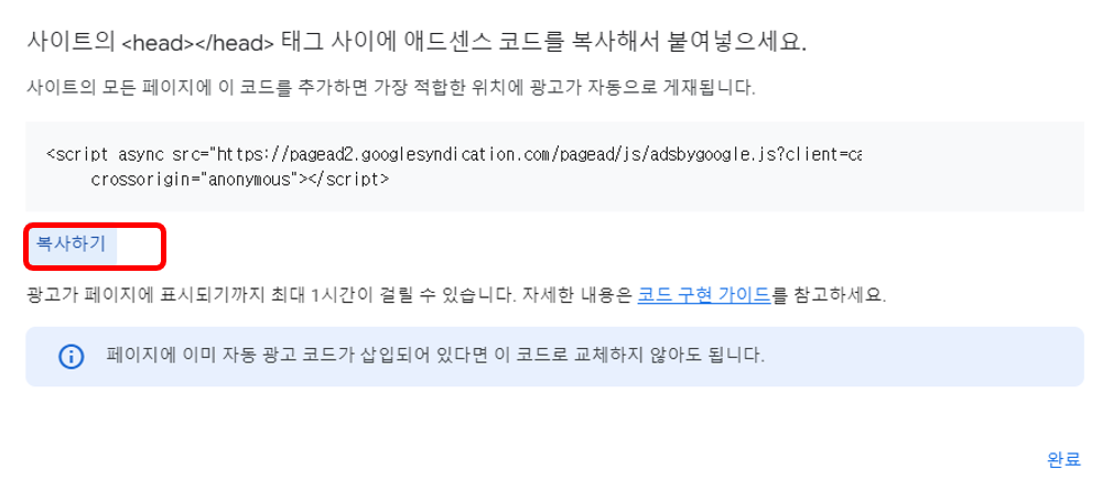 복사하기를 눌러서 코드를 복사합니다. 그리고 이제 티스토리에 가서 광고코드를 붙여 넣으시면 됩니다.