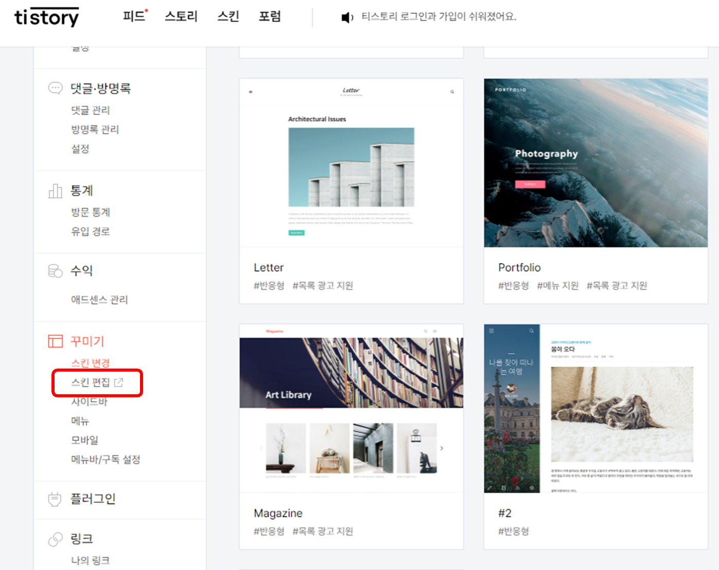 먼저 티스토리의 꾸미기 - 스킨 편집 메뉴에 들어갑니다.