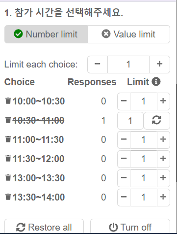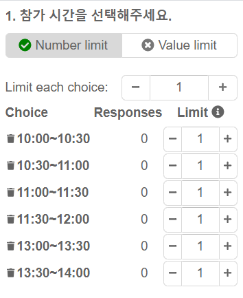 이 후 Number limit을 설정하고 Limit each choice에 1을 주면 시간대별로 1명만 선착순으로 신청이 가능하게 됩니다.