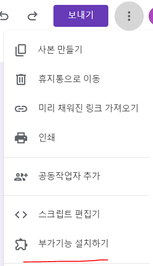 먼저 구글 폼즈에서 더보기(점3개)를 눌러서 부가기능 설치하기를 누릅니다.