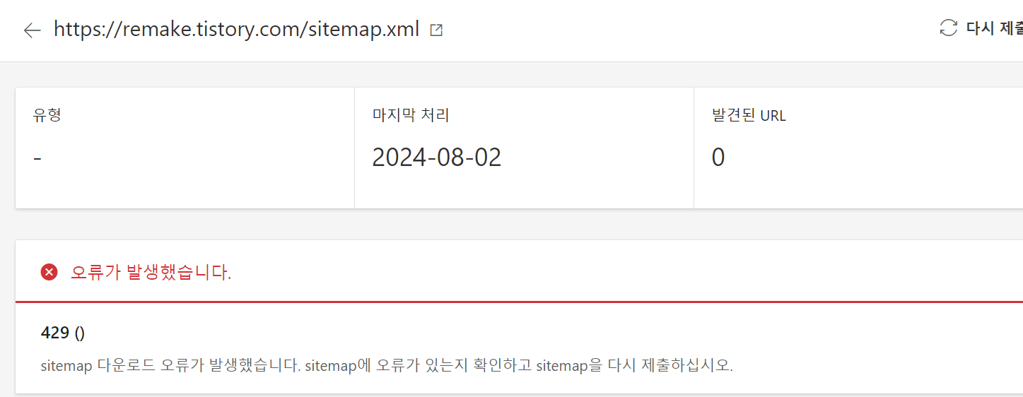 4. 현재 사이트맵은 동작하나, 오류 코드 429는 사용자 측에서 요청이 너무 많았기 때문에 문제가 발생했을 수 있음을 나타냅니다