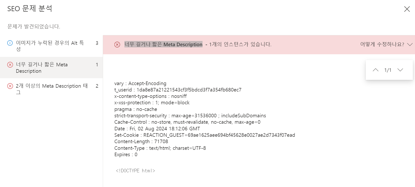 7. 이 뿐만 아니라 빙에서 너무 길거나 짧은 Meta Description이라는 메시지도 나오는데요.