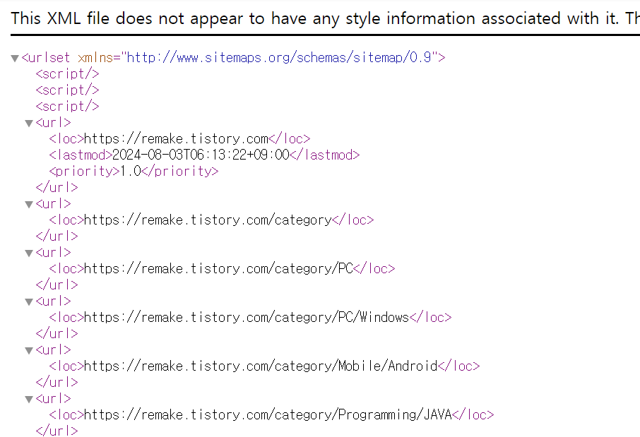2. 하지만 티스토리의 sitemap인 *.tistory.com/sitemap.xml은 동작하지 않습니다