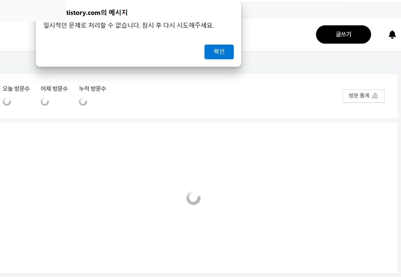 현재 2차 도메인을 연결한 티스토리만 접근을 하려고 하면 일시적인 문제로 처리할 수 없습니다. 잠시 후 다시 시도해주세요. 라는 메시지가 나옵니다.