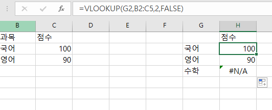 다만 수학처럼 없는 값이 있는 경우 #N/A에러를 발생하게 되는데요.
