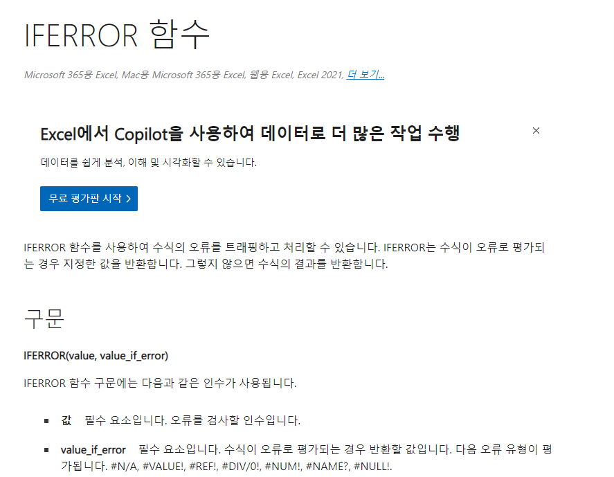 iferror함수는 엑셀에서 수식의 오류가 발생하면 특정한 겂을 반환하는 함수인데요.