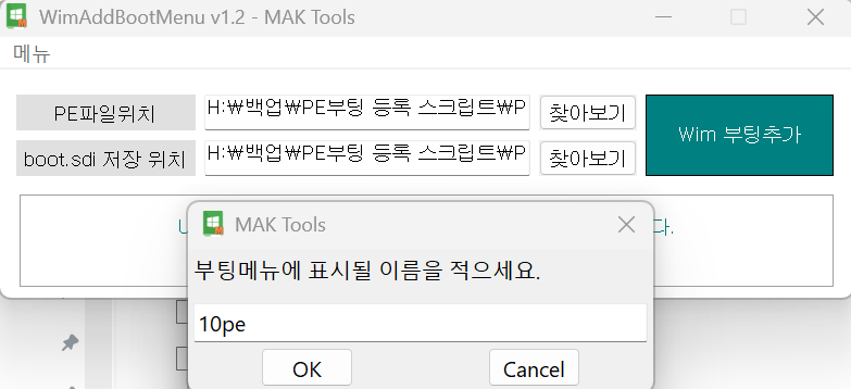 그리고 wim부팅 추가를 누르면 기본적으로 부팅메뉴에 표시될 이름이 파일이름으로 설정되어 있는데요.