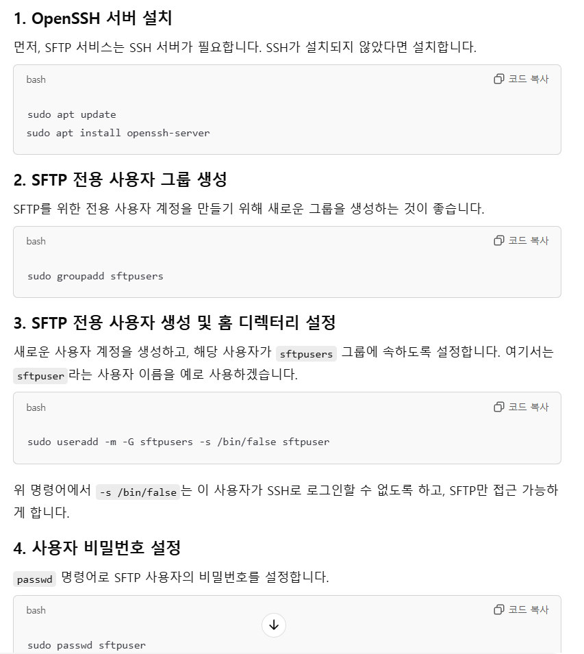 ChatGPT에게 물어보니 먼저 openssh를 설치하고 sftp 전용 계정을 생성하라고 합니다.