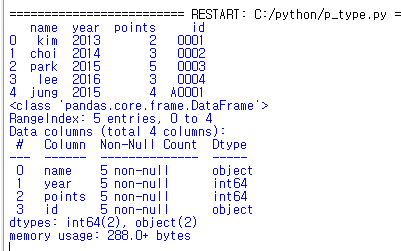 먼저 기본 데이터를 입력하고 info를 통해서 타입을 확인해 봅니다.