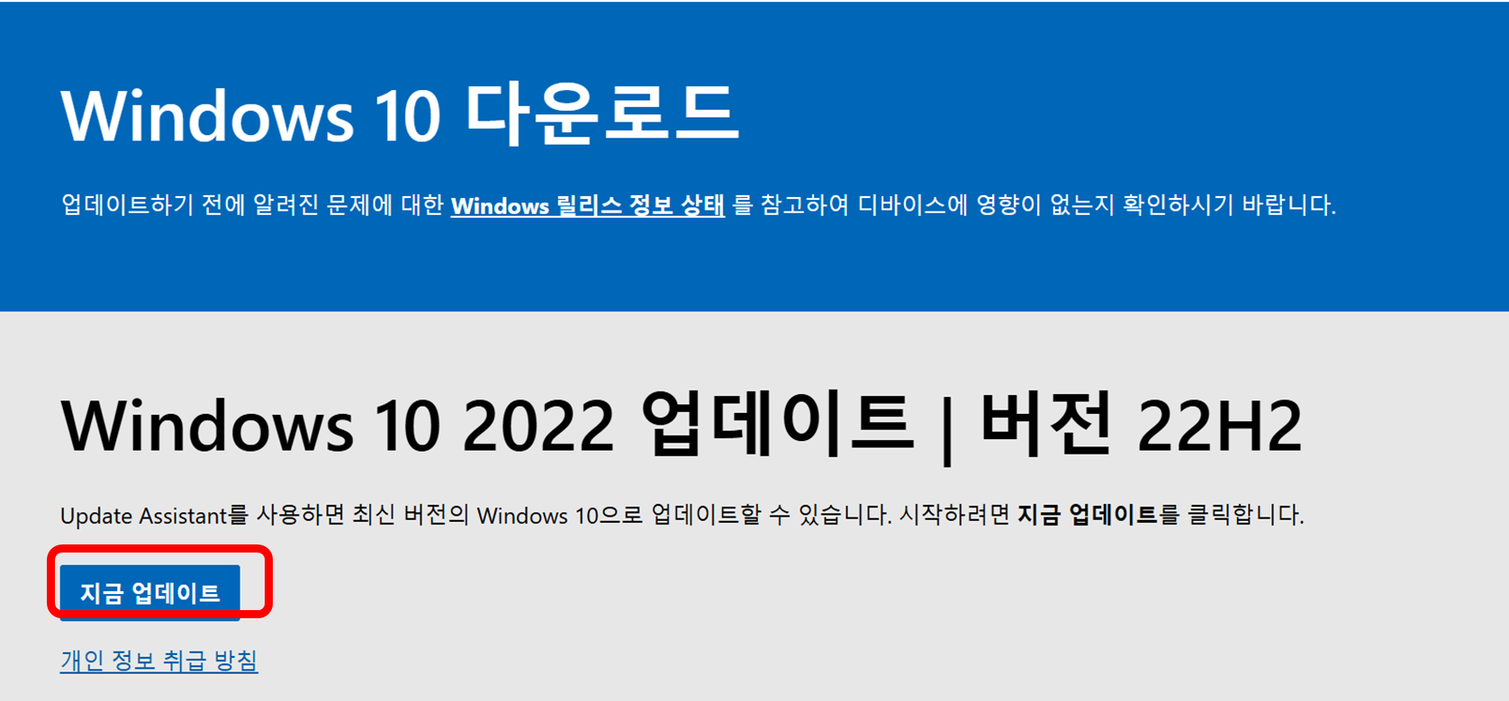 그리고 지금 업데이트를 눌러서 윈도우 10의 업데이트를 실행합니다.