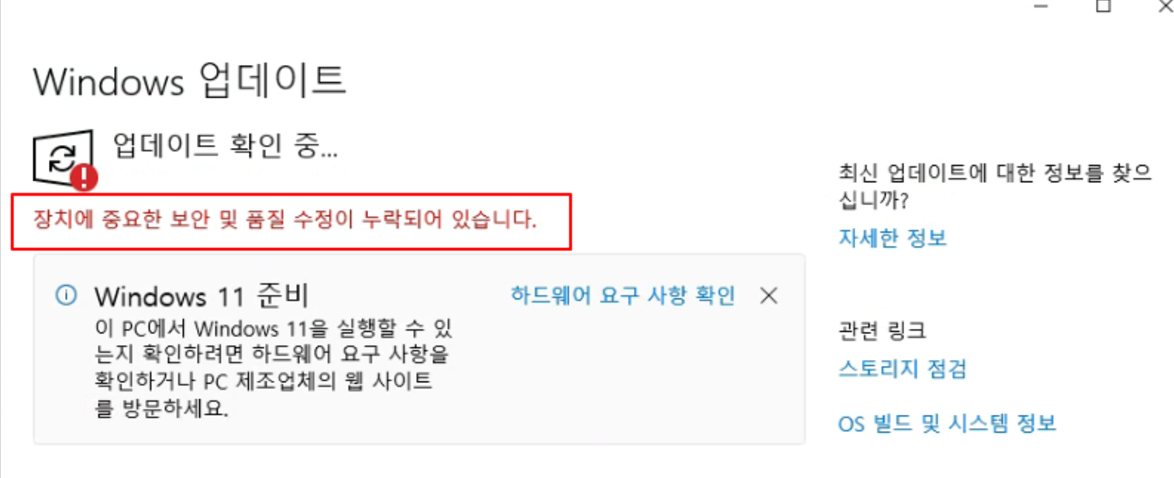 오랜만에 윈도우를 업데이트하러 들어갔더니 아래처럼 장치에 중요한 보안 및 품질 수정이 누락되어 있습니다.라고 메시지가 뜨고 업데이트가 안되는데요.