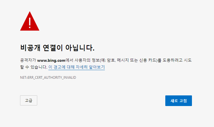 | 이 사이트의 인증서가 잘못되었습니다. 이 연결이 안전하지 않기 때문에 암호 또는 신용 카드와 같은 정보가 이 사이트에 안전하게 전송되지 않으며, 다른 사람들이 가로채거나 볼 수 있습니다. 이 사이트에 개인 정보를 입력하지 않거나 이 사이트를 사용하지 않는 것이 좋습니다. 자세히 알아보기 |
