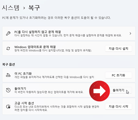 설정 - 시스템 - 복구 메뉴에서 돌아가기를 선택합니다.