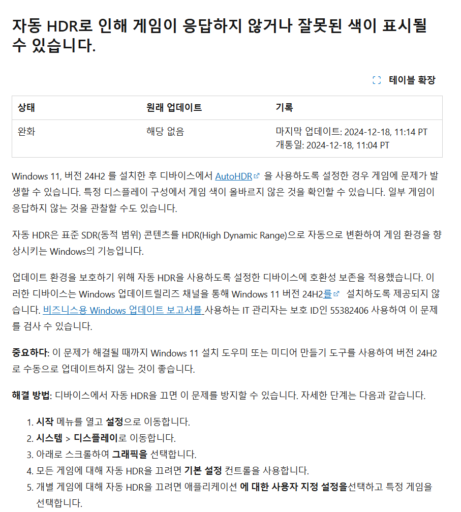 업데이트 환경을 보호하기 위해 자동 HDR을 사용하도록 설정한 디바이스에 호환성 보존을 적용했습니다. 이러한 디바이스는 Windows 업데이트릴리즈 채널을 통해 Windows 11 버전 24H2를 설치하도록 제공되지 않습니다. 비즈니스용 Windows 업데이트 보고서를 사용하는 IT 관리자는 보호 ID인 55382406 사용하여 이 문제를 검사 수 있습니다.