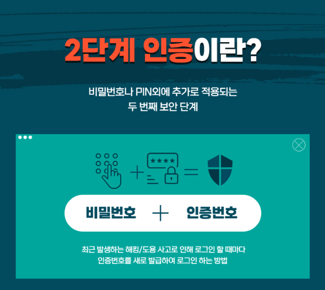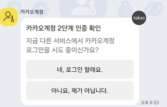 - 이 경우, 로그인 시 추가로 인증 앱이나 문자, 카카오톡 알림을 통해 인증을 받아야 합니다.