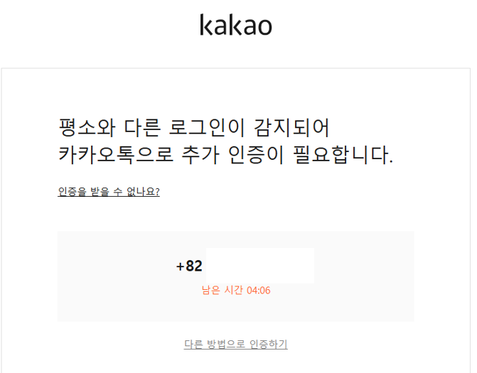 오랜만에 카카오톡으로 접속하려고 했더니 아래처럼 평소와 다른 로그인이 감지되어 카카오톡으로 추가 인증이 필요합니다. 라는 메시지가 나왔습니다.