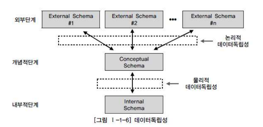 - 외부 스키마 : 개별 사용자 관점에서 데이터베이스 이해, 각가의 프로그래머가 접근하는 데이터 정의