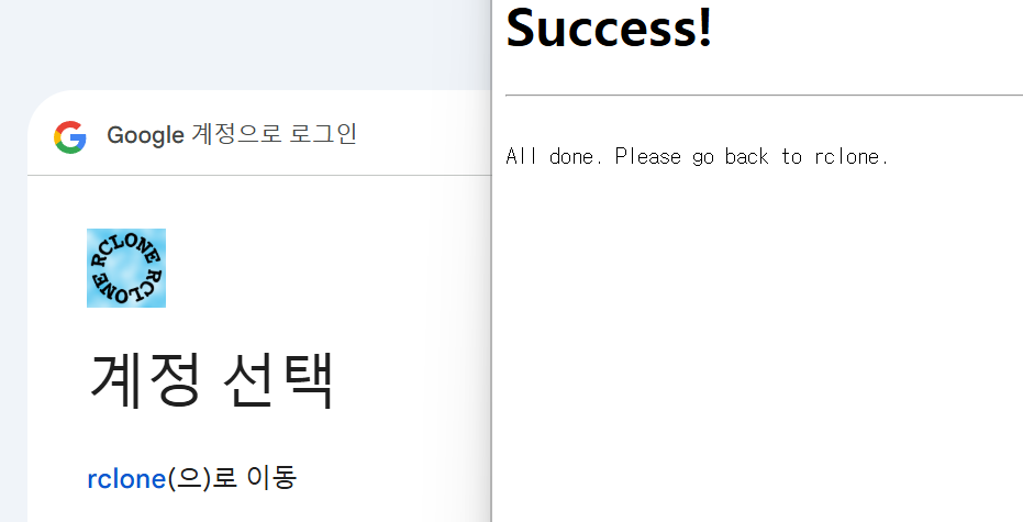 웹브라우저가 실행되고, 구글 아이디로 로그인하면 success라는 메시지가 나옵니다.